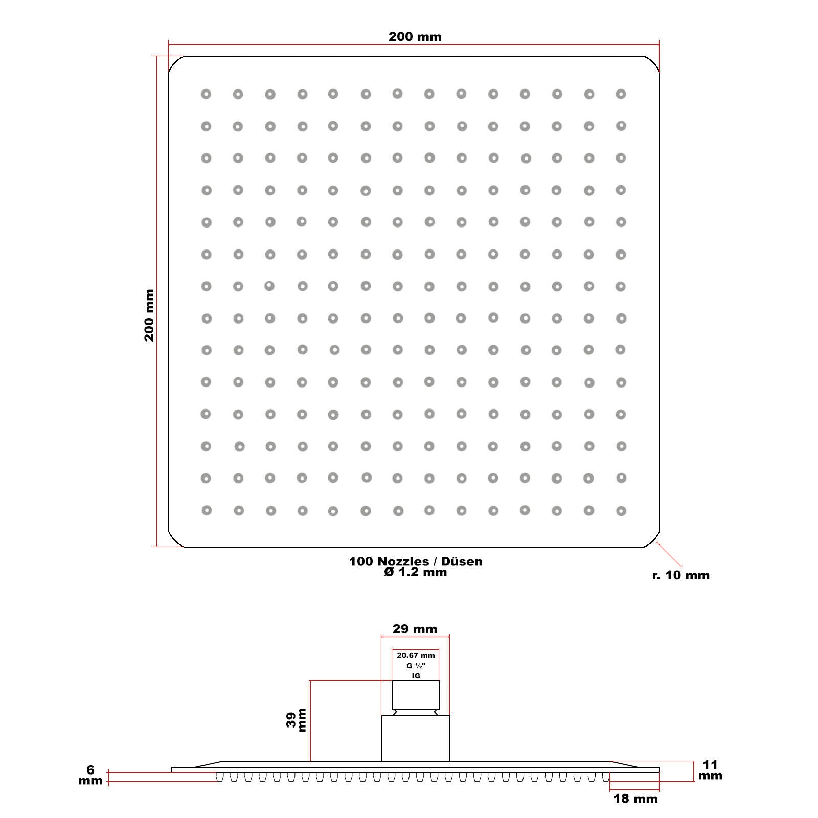 Pommeau de douche carré pomme jet de pluie tête douche 20 x 20cm acier inoxydable 16_0000625