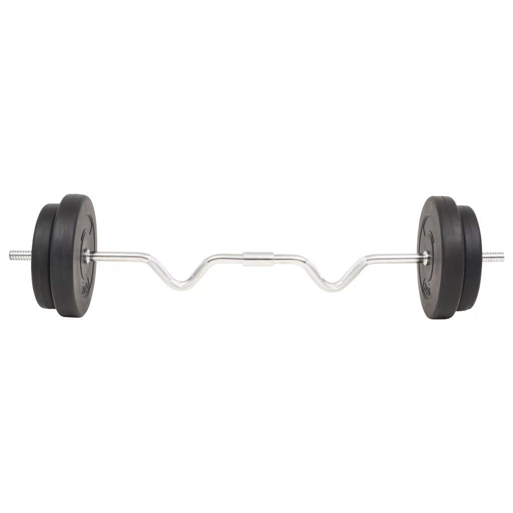 Il comprend deux disques de 7,5 kg, deux disques de 5 kg et une barre d’haltères de 5,4 kg et pèse environ 30 kg.