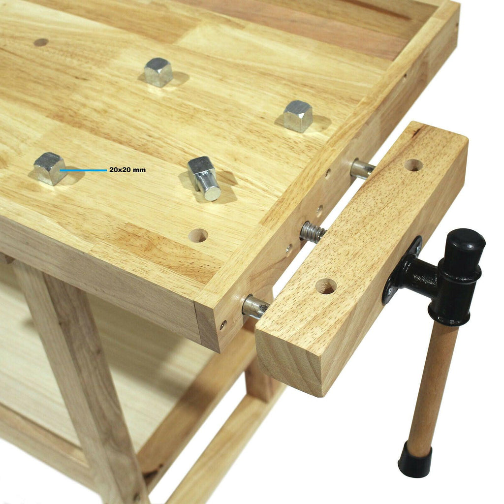 L’établi est fabriqué en hévéa (appelé aussi rubberwood), qui se caractérise par sa robustesse et stabilité ; cette dernière est accentuée par l’épaisseur de 50 x 50 mm des pieds de table.