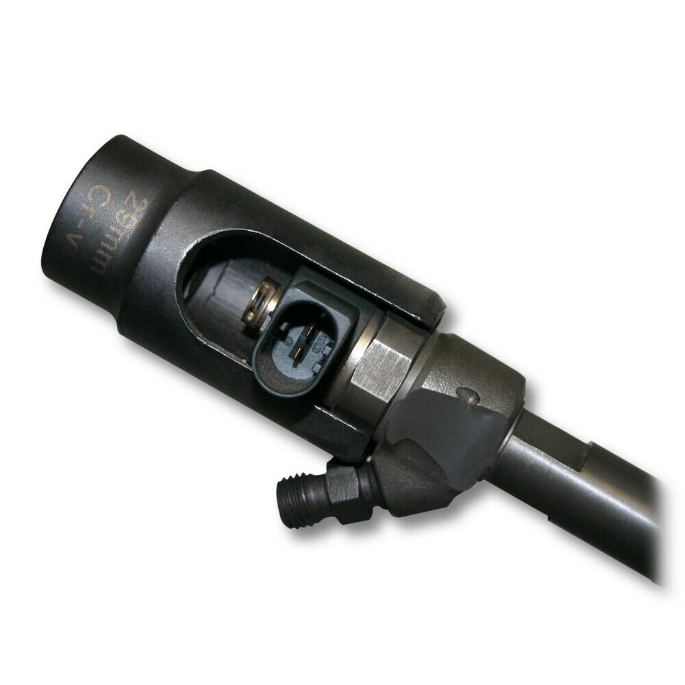 Vous recevrez aussi une douille spéciale avec vis à tête hexagonale (surplat 29 mm) et un embout carré de 1/2", qui s'ouvre latéralement pour démonter facilement la tête de la buse de l'injecteur, approprié entre autres pour les marques Bosch, les moteurs CDI et les gammes Mercedes OM 611, 612, 613.