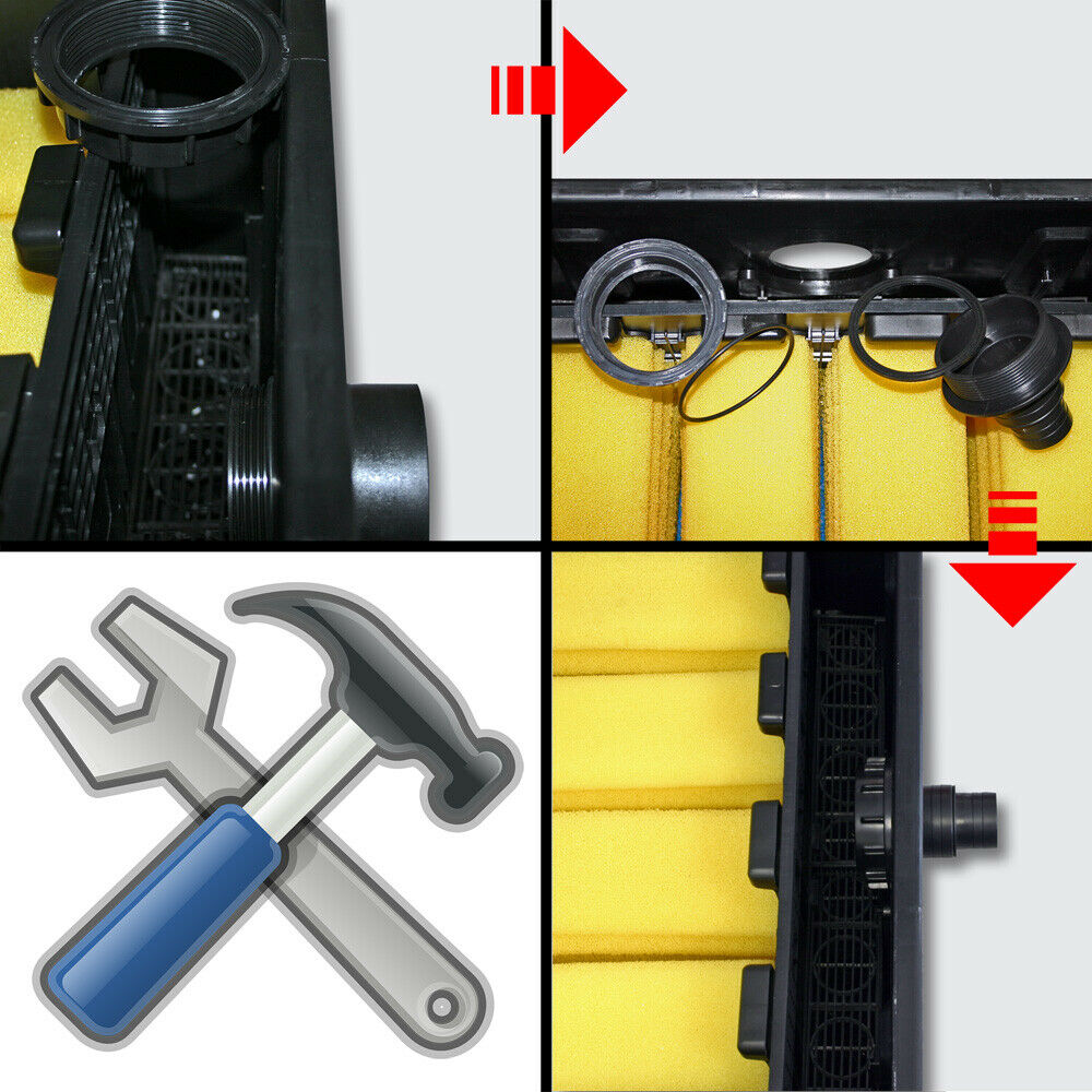 Le filtre de bassin se place aux bords du bassin et se relie à une pompe de bassin appropriée (non incluse à la livraison.