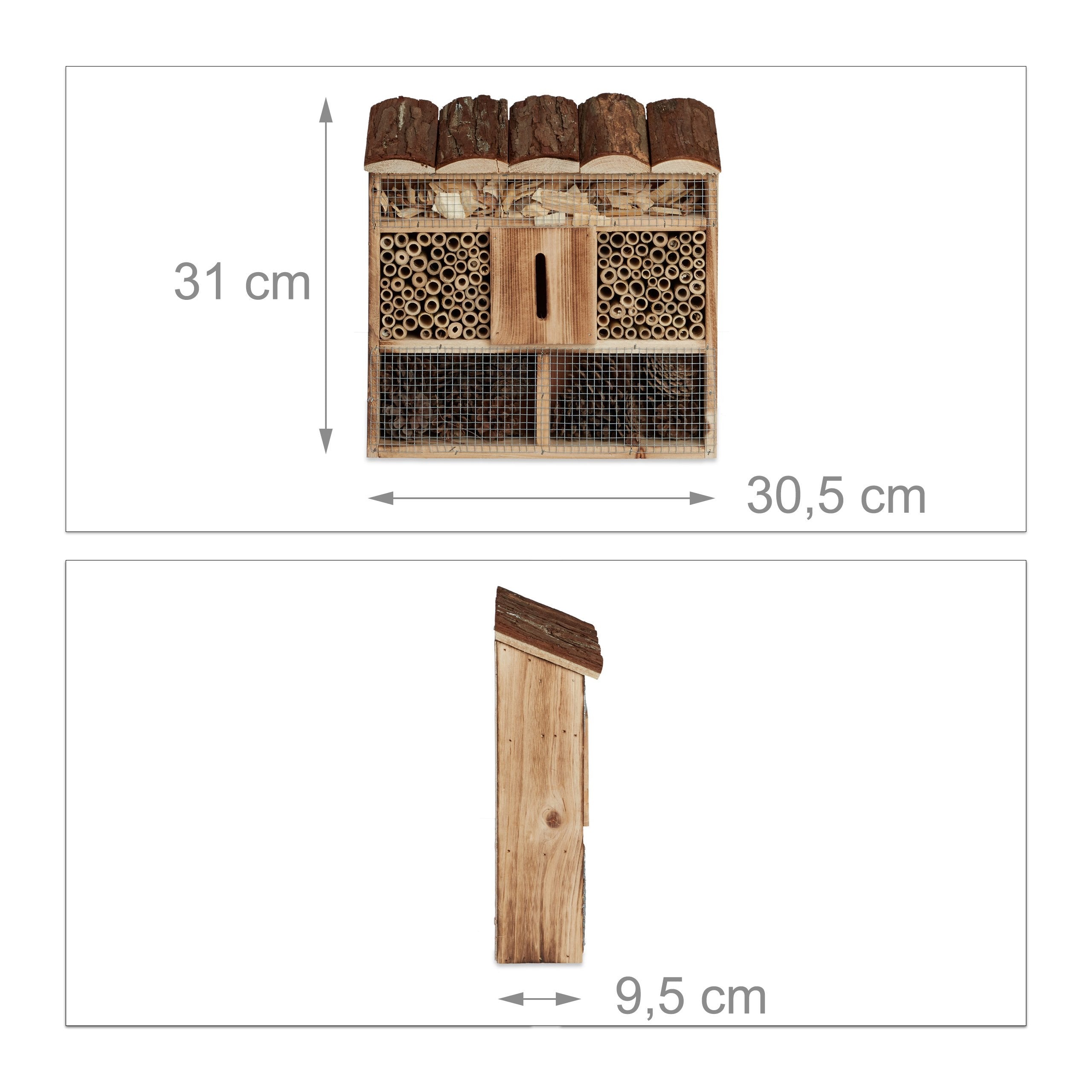 Cette maison à insectes offre beaucoup de place pour les abeilles et coccinelles et un abri pour les papillons. Les morceaux de bois et pommes de pin seront très appréciés des insectes volants et coccinelles. Guêpes et abeilles trouveront place dans les branches creuses.