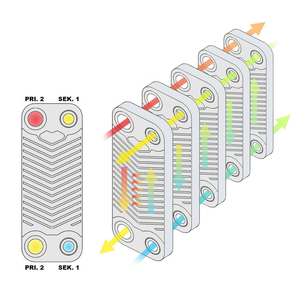 En les assemblant, une plaque sur deux est tournée à 180 degrés ce qui permet de créer deux espaces en sens contraire l'un de l'autre, dans lesquels les fluides passent en contre-courant.