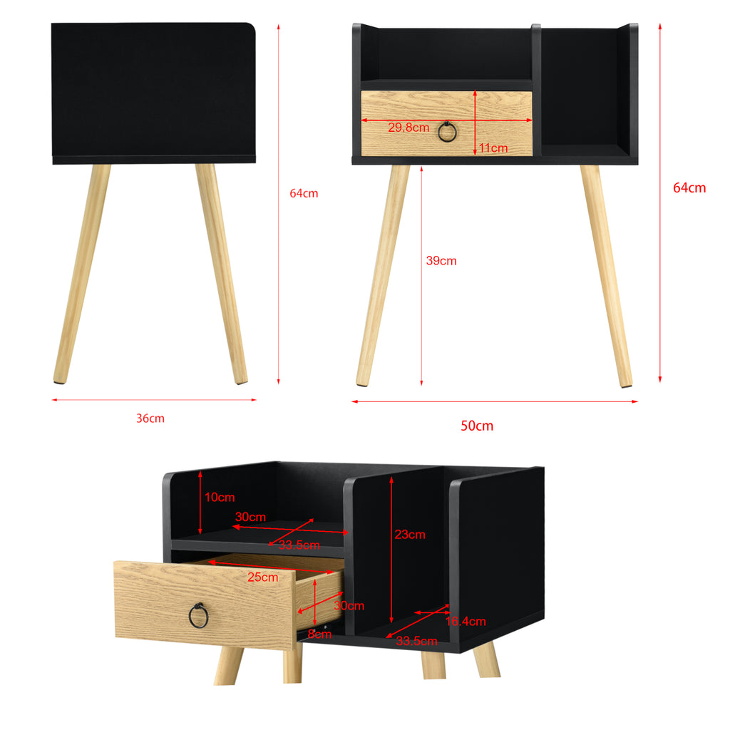 Table de chevet tiroir et 2 surfaces de stockage chevet commode panneau de particule bois pieds en pin 64x50x36 cm noir effet bois 03_0004230